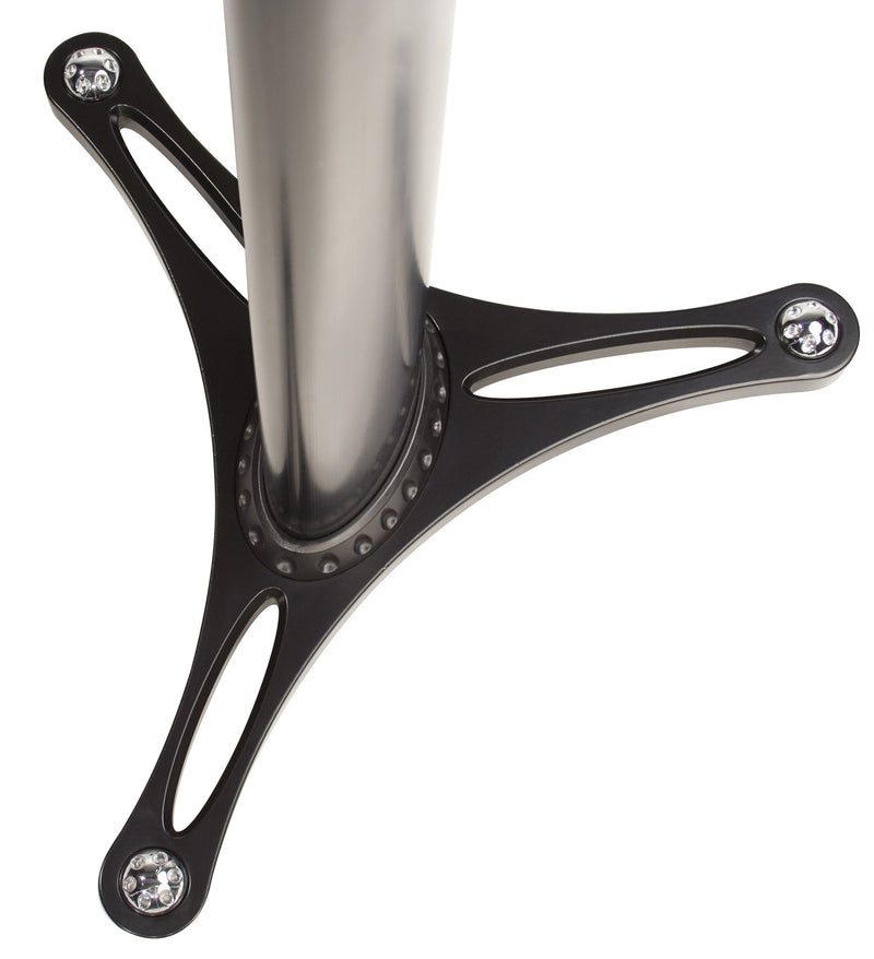 From top to bottom these stands feature sonic isolation and decoupling components. Four non-marring sound decoupling pads provide the first stage of isolation. Two additional rubber decouplers between the column and the top/bottom plates add to the isolation system. At the heavy cast-aluminum base three spike feet include removable rubber isolation pads to adapt to bare or carpeted floors.